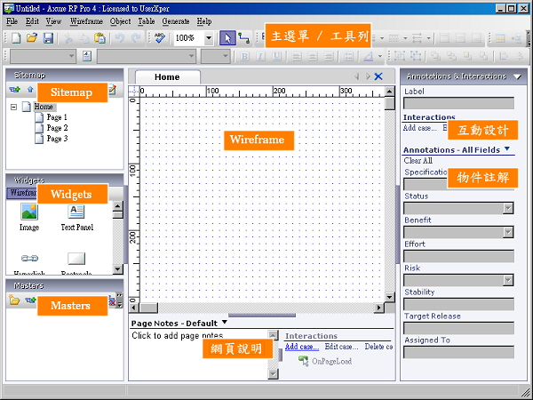 於演示的網頁文件和規格文件,以提供演示與開發。Axure 唯一的缺點就是對中文支援不夠友好,