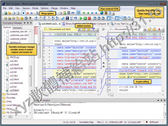 UltraCompare 是一款文件內容比較工具。可進行文本模式,文件夾模式以及二進位模式